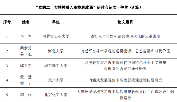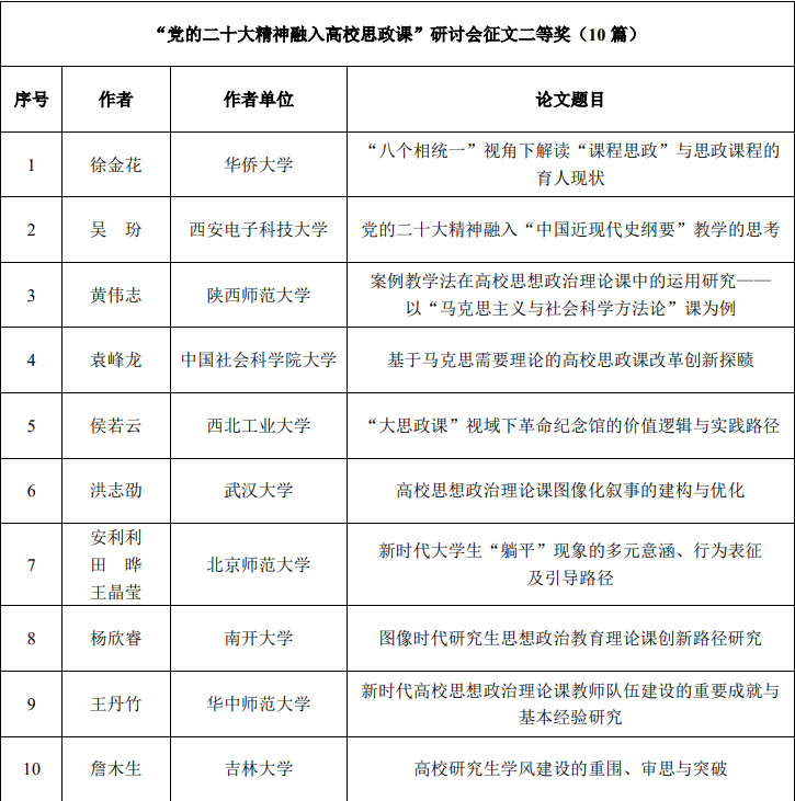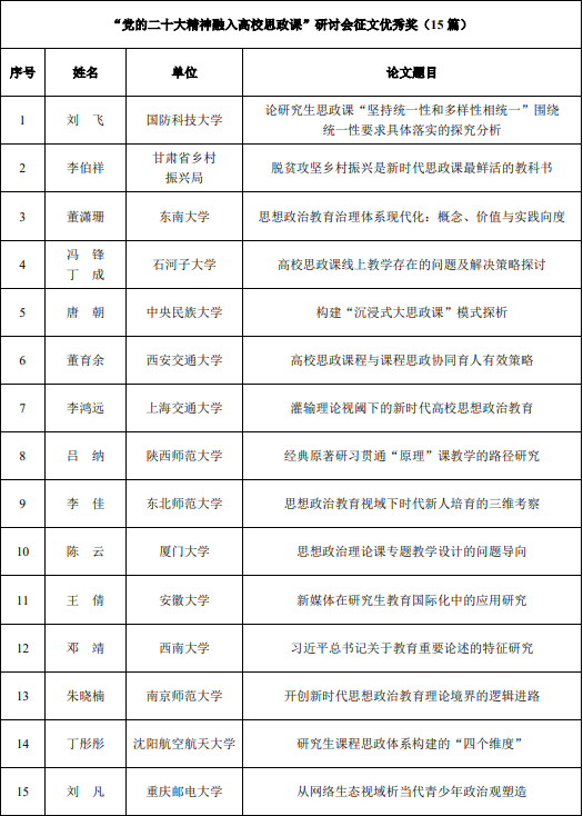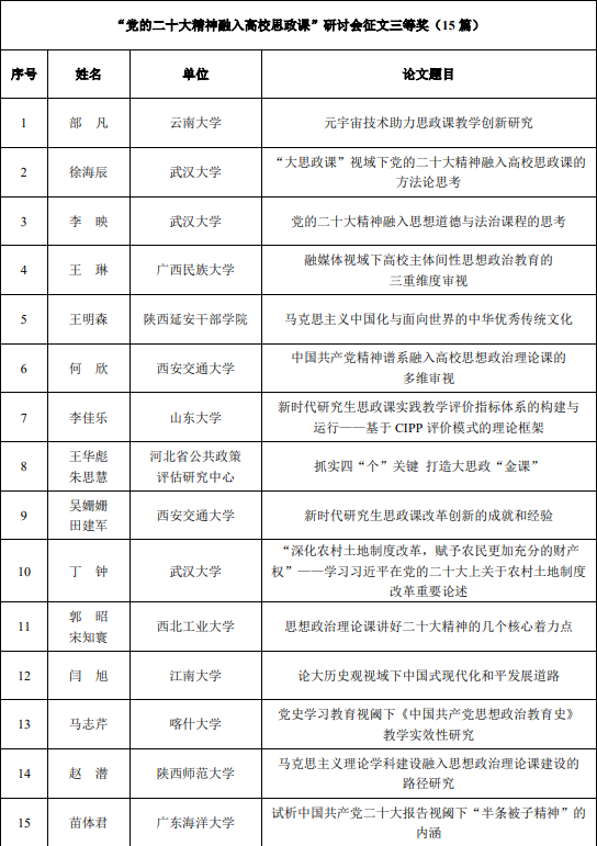 绅士漫画 绅士漫画 关于“党的二十大精神融入高校思政课”研讨会自通知发布以来,得到了全国各高校师生的热烈响应,累计收到300多篇来稿,经主办方组织专家认真评审,现选出获奖论文45篇,其中一等奖5篇,二等奖10篇,三等奖15篇,优秀奖15篇。名单公布如下:
