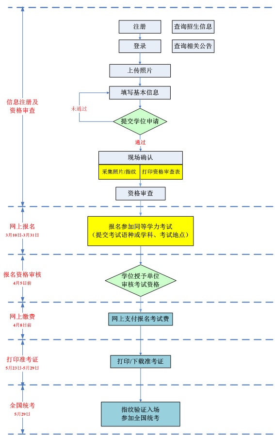 2016年2月22日至2月28日,请登陆“中国学位与研究生教育信息网”网址//www.cdgdc.edu.cn ,通过“在职硕士-同等学力统考”开展申请人注册、登录、提交信息等工作。