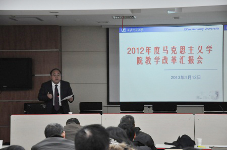2012年开展的主要工作作了总结,对2013年的工作进行部署。同时,他传达了2012年6月6日国务院学位 委员会《关于进一步加强高校马克思主义理论学科建设的意见》的文件精神,强调了对思想政治理论课教师提出的“一岗双能”、“一身两任”的具体要求。关于 2013年的工作重点,王院长特别强调了教育部关于 “十八大精神进课堂”的最新精神和一些具体要求。