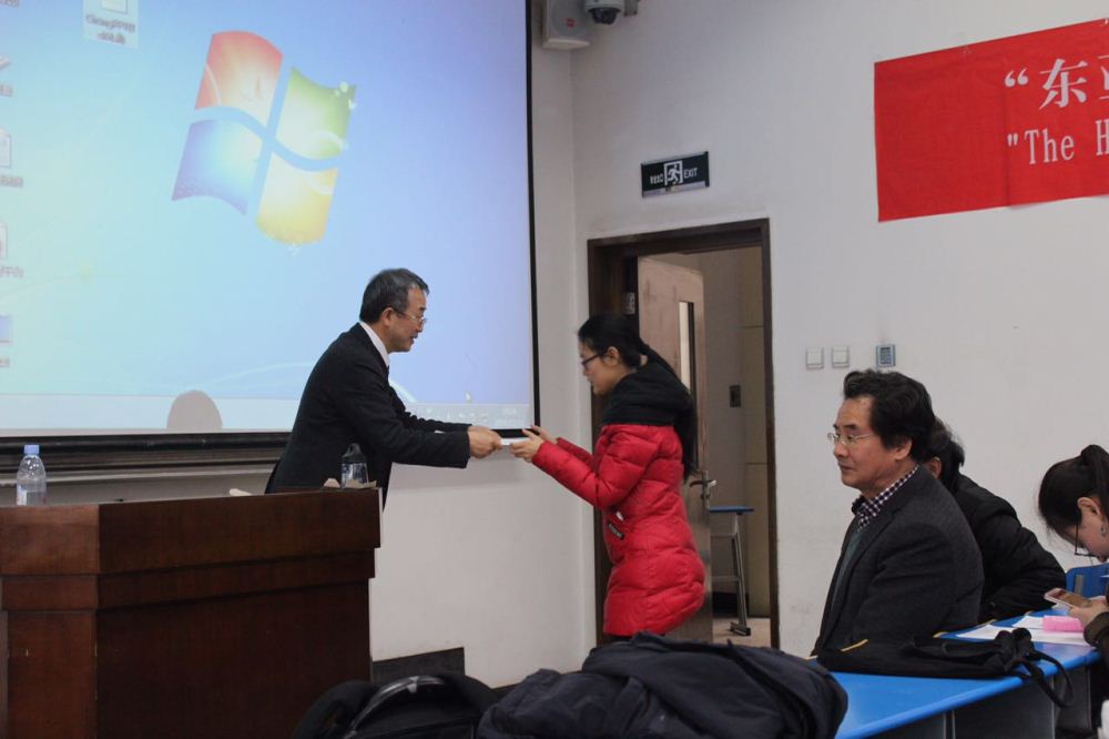 本年度我校共有540余名本科生选修《东亚文明的历史进程》,经过层层筛选,共有20位学生所提交的论文获奖。郑俊坤教授在演讲完毕后,对获奖学生颁发了获奖证书和奖学金。
