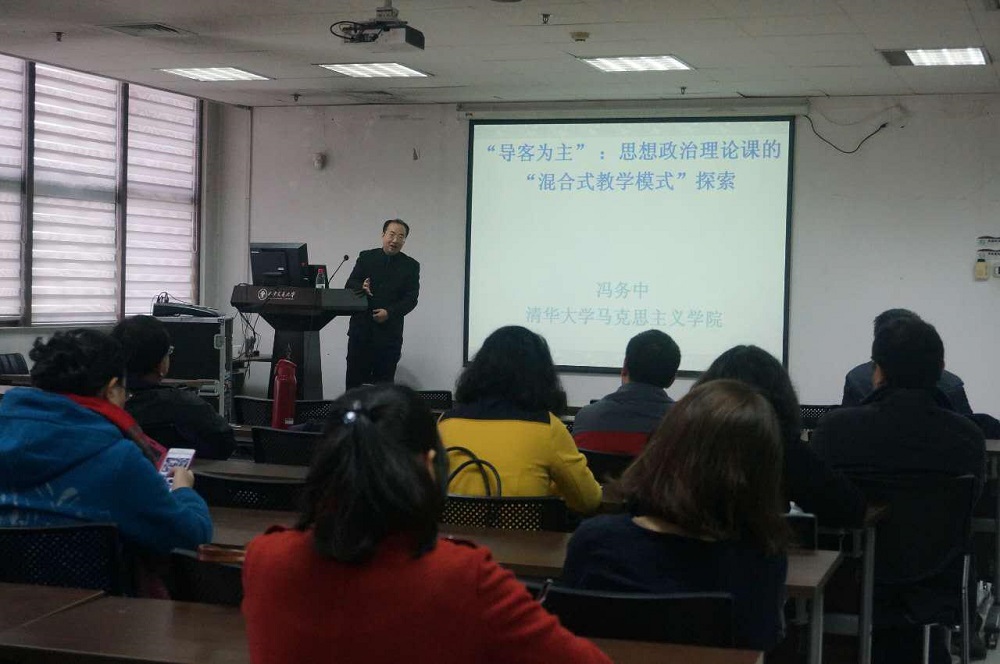 思想政治理论课程MOOC建设水平,学院邀请冯务中老师来院做《思想政治理论课“混合式教学模式”探索》专题报告,与我院教师分享MOOC建设的经验。在报告中,冯务中老师提出要借助MOOC平台,以混合式教学模式,推动思政课实现“导客为主”教学模式的转变。