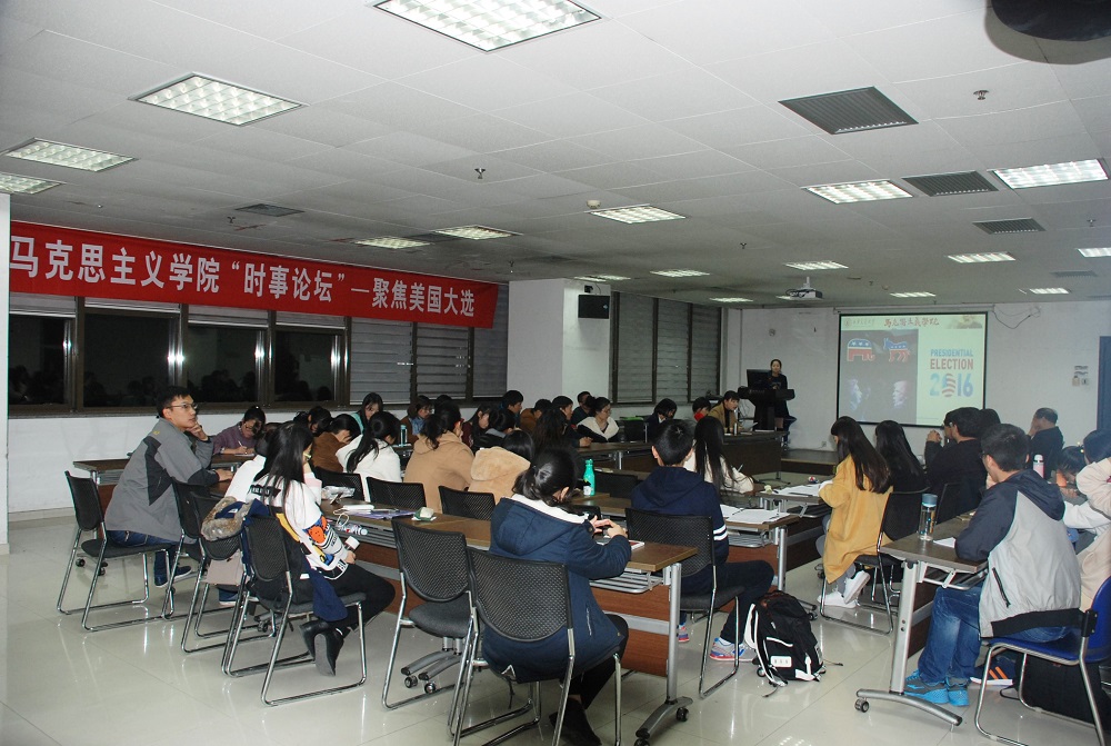 王宏波院长,党委副书记宋永平老师、中国马克思主义研究所所长陆卫明老师以及我院团工委书记耿嘉敏老师也出席了此次论坛。参加此次论坛的人员有我校各学院、各专业的本科生和研究生,以及对美国大选感兴趣的外校老师、同学,论坛由我院团工委副书记袁欣主持。