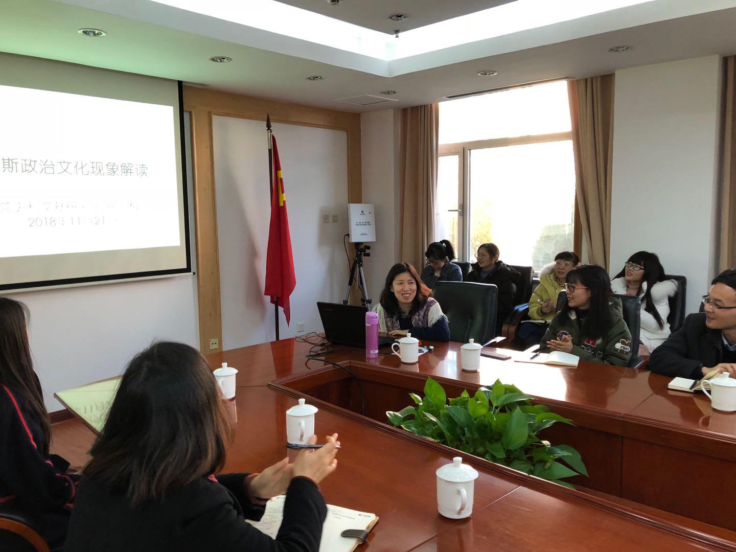 随后,中央党史和文献研究院第四研究部编辑四处处长徐向梅老师为同学们作了有关“俄罗斯政治文化现象”的主题报告。徐老师从俄罗斯地理位置、历史进程、政治制度、经济情况和宗教信仰等方面贯穿古今,详细叙述了俄罗斯政治文化的发展。同时,徐老师还结合自身俄罗斯访学的经验,以生动活泼的语言,带领同学们从不同的视角看待俄罗斯政治生态和现存问题。