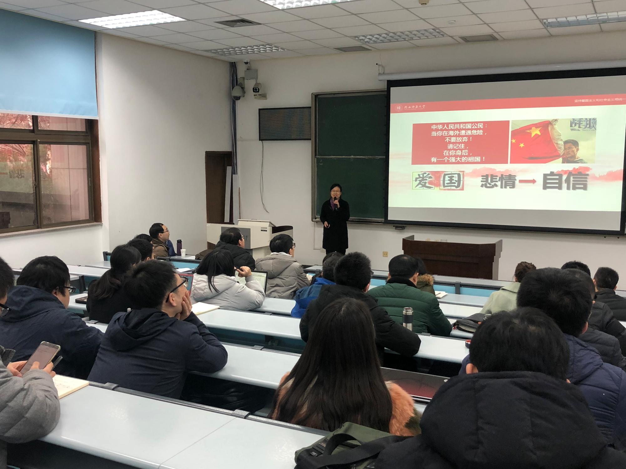 宋吉玲老师为为师生作了题为“坚持爱国主义和社会主义相统一”的示范教学。她从2017年热映的电影《战狼2》导入,采用设问式方法提出“何为爱国之国”等问题引发大家思考,在此基础上,深入浅出地解读了爱国主义的基本内涵。接着,从历史逻辑、现实逻辑与理论逻辑相结合的视角,为大家详细讲授了爱国主义与社会主义在中国场域中融合、警惕爱国主义误区等一系列重难点问题,并提出了新时代青年学子爱国的使命与担当。她还从政治观、思想观、教学观、科研观4个方面,向大家分享了自己从事思想政治理论课教学的经验与体会。