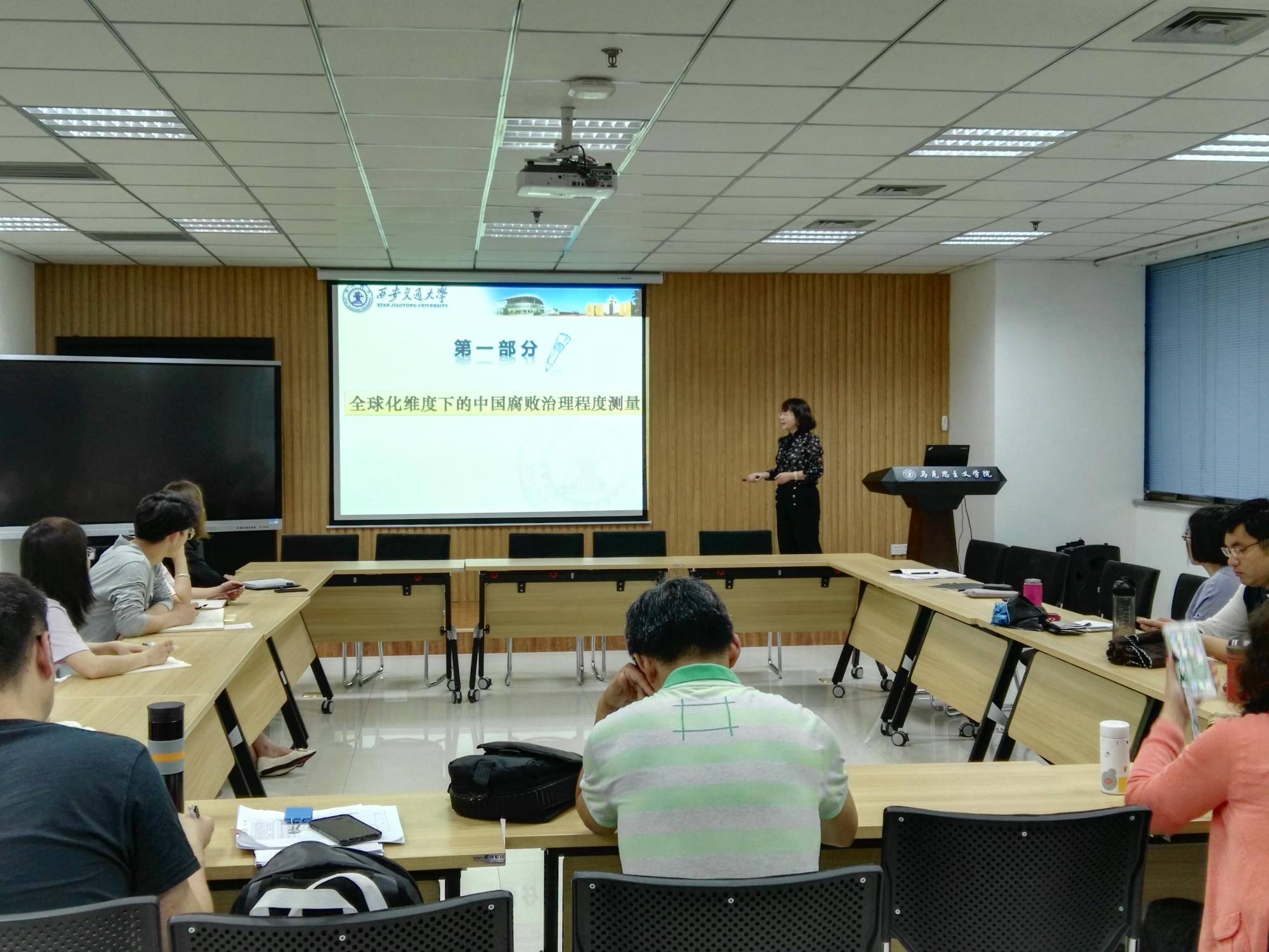 杜晓燕副教授为师生分享了题为《改革开放四十年来中国腐败治理的多维测量》的研究成果。杜老师基于宏观和微观的双重视角,从全球、历史、个案、个体四个维度出发,分别对中国腐败治理程度、治理趋势、案件特征、公务员腐败治理预期进行了系统的测量与分析。
