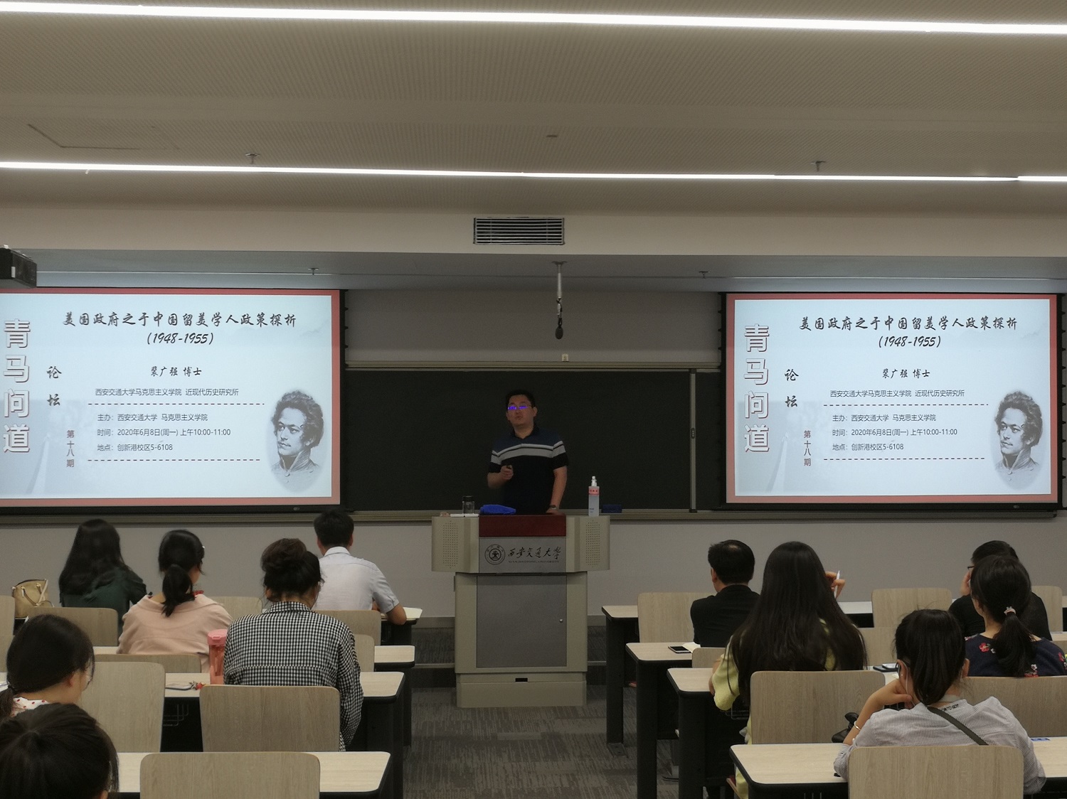 讲座伊始,裴广强博士以当前美国特朗普政府对中国留美学人的政策分析为切入点,引入本次论坛所要讲授的主题。随后,他从问题的提出、美国的做法、中美双方会谈、中国留美学人的个人选择等方面,系统解读了1948年至1955年美国对中国留美学人政策的变化,全面分析了变化的原因,指出国家利益是导致这些变化的根源。在交流环节,裴广强博士就研究1948年-1955年美国留学政策时间段的特殊思考,当前美国对中国留美学人的政策考量以及我国接收国外留学生的政策分析等问题逐一进行了解答,并勉励同学们要冷静观察、深入研究中美关系和相关政策的变迁,及时了解前沿问题,拓展学术思维,写出具有理论深度的文章。