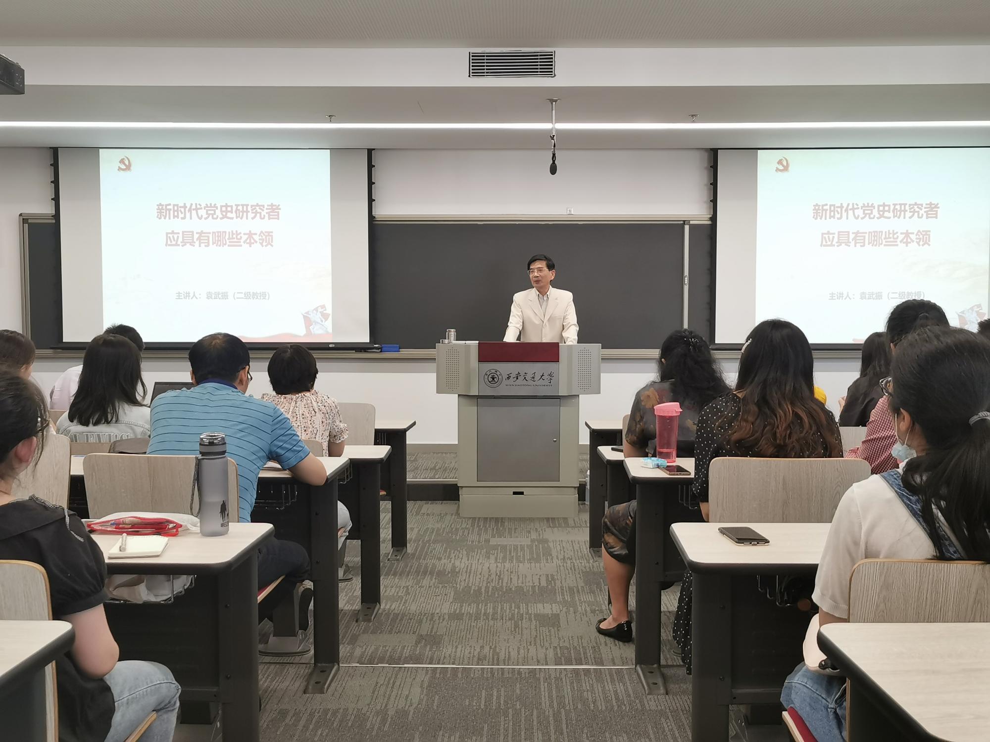 首先,袁教授围绕新时代党史研究者应具备的本领和素养进行了重点阐述。第一,提升思想道德素养。作为新时代的党史研究者,要有情怀、有担当,大格局成就大学问。第二,提升理论政策素养。党史研究者要不断提升理论水平、政策水平,把握好党史研究的正确方向。第三,要提升党史业务素养。党史研究者要认真研读党史基本著作,要在搜集、整理、鉴别、利用党史资料上下功夫,还要有扎实的学术功底。随后,他向同学们讲述了自己多年从事党史研究的体会,并用生动形象的实践案例,为大家详细介绍了新民主主义革命时期中国共产党在陕西传播马克思主义以及建立党组织的历史过程。最后,袁教授强调,历史、现在与未来是息息相通的,只有在历史问题上形成认同,才能正视现实,走好未来。