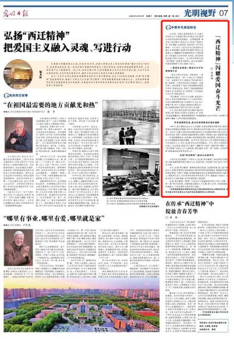 弘扬“西迁精神”,需要广大知识分子紧紧抓住西部大开发、共建“一带一路”等历史机遇,为国家建设提供人才支撑、智力支持,为国家富强、民族振兴、人民幸福作出更多更大贡献。