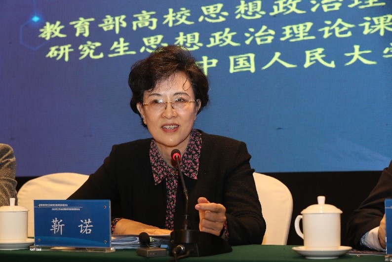 教育部高校思想政治理论课教学指导委员会主任委员、教育部研究生思想政治理论课分教学指导委员会主任委员、中国人民大学党委书记靳诺教授主持开幕式并做主旨报告。她强调这次会议的任务是深入学习贯彻党的十九届四中全会精神,坚持以习近平新时代中国特色社会主义思想为指导,认真学习贯彻落实习近平总书记“3·18”重要讲话精神,推动落实中共中央办公厅、国务院办公厅《关于深化新时代学校思想政治理论课改革创新的若干意见》,以及《新时代爱国主义教育实施纲要》落地落实,在研究生教育教学层面扎实推进习近平新时代中国特色社会主义思想“三进”工作,切实提升研究生思想政治理论课教学时效性,推动建设高层次高质量的研究生思想政治理论课。为此要提高政治站位,有强烈的责任感、使命感和清晰的方位感,把握新时代研究生思想政治理论课改革创新的核心要义。她认为2019年是不平凡的一年,学校思想政治理论课改革持续推进、不断向好;改革措施务实有效;课程体系更加丰富;支持保障更加有力;工作格局不断拓展,教育部研究生思想政治理论课分教学指导委员会在推动工作方面取得了积极成效。2020年要以理论研究的深入推动教学内容升华,以学科建设发展领航课程体系建设,以深化调研成果的运用进一步推进教材体系建设,以强化队伍建设提升教师能力水平的提高,以强化机制建设增强课程满意度,有新进展、新面貌、新成果。