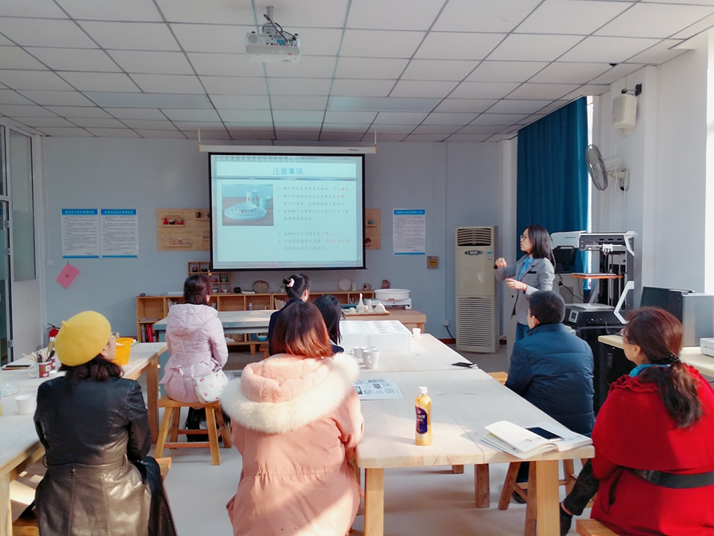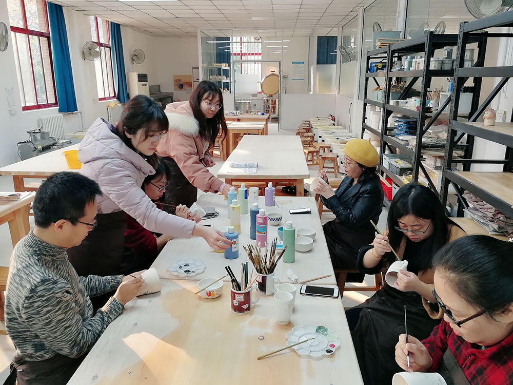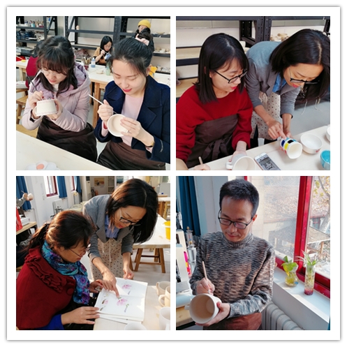 工会在校工程坊B区陶艺教室组织了陶艺活动,十余位教职工参加了活动,绘制了精美的陶艺作品。