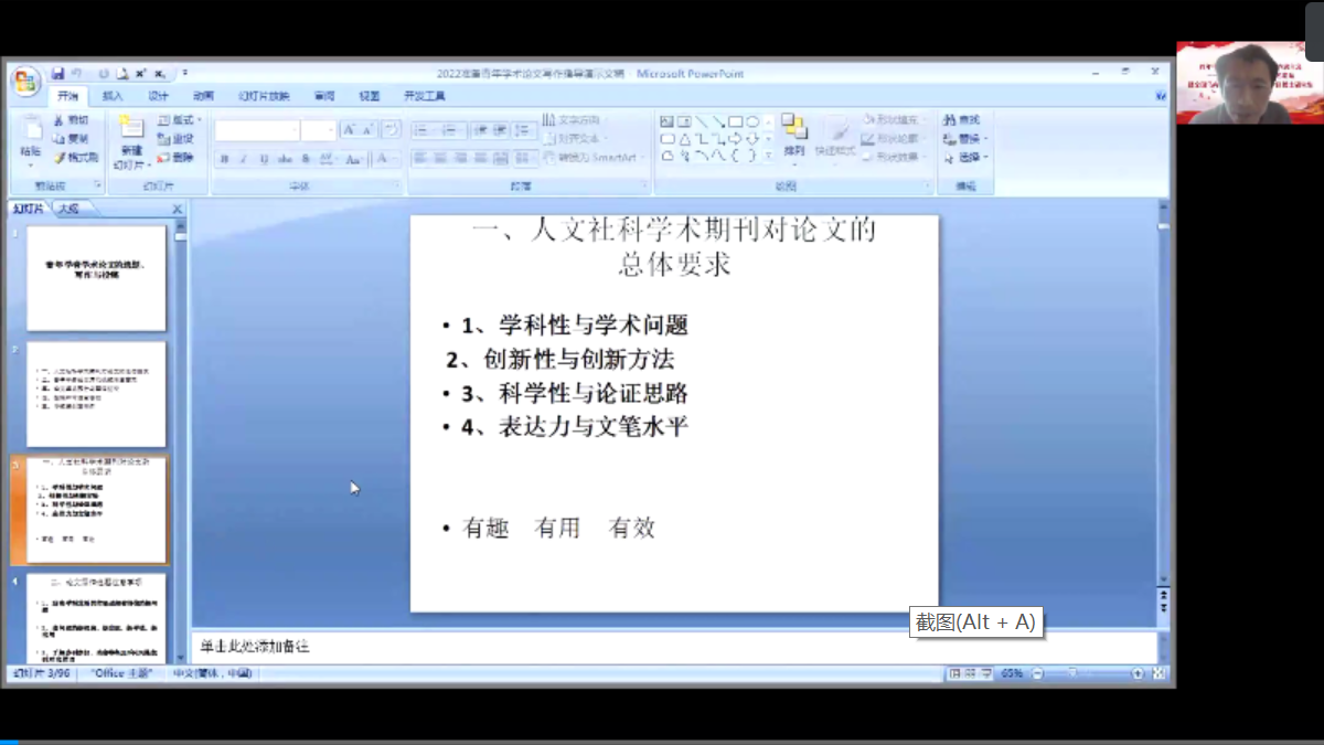 魏新老师立足长期从事期刊编辑工作的丰富经验,从人文社科类学术期刊对稿件的要求、论文选题、论文结构与写作、投稿等四个方面介绍了如何撰写一篇好的学术论文并顺利发表。魏新老师指出,人文社科学术期刊对稿件的要求概括起来就是“有趣、有用、有效”,论文选题既可以选取学科发展前沿、有价值的新问题,也可以选取老问题并从新视角、新资料、新发现等方面进行研究;并从论文标题、摘要、文字表述等方面提出了针对性建议。