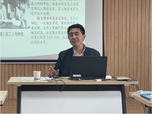 院长燕连福作了题为《陈大燮:扎根西部的热力工程教育先驱》的报告,从先生之信仰、先生之治学、先生之专研、先生之雅趣、先生之家风五个方面介绍了陈大燮的故事,并指出陈先生拥有崇高信仰,是第一个在交大校刊公开撰文支持西迁的教授,率先提出了交通大学分设上海、西安两地的方案;他学识渊博,治学严谨,关爱后学,坚守一线;他著书立说,潜心科研,关注学科和梯队建设;他正直为人、大局为重,生活俭朴、艰苦奋斗,默默付出、无私奉献。燕老师以陈大燮先生的感人事迹,勉励马院学子要传承好西迁精神,努力成长为能够担当民族复兴大任的时代新人。