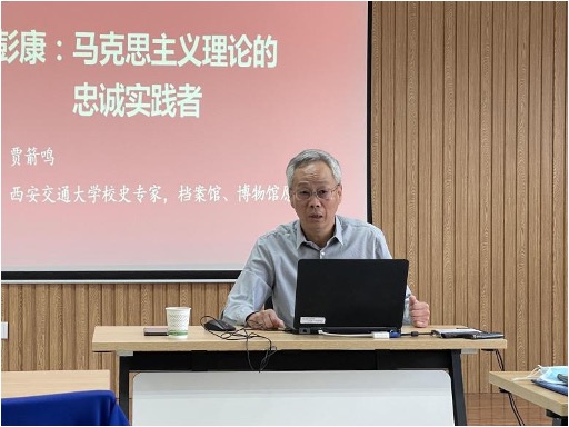 校史专家,档案馆、博物馆原馆长贾箭鸣作了题为《彭康:马克思主义理论的忠实实践者》的报告,并指出彭康是具有深厚马克思主义理论修养的杰出共产党人,为中国人民解放事业做出了卓越贡献;他成功组织领导了交通大学西迁,实现了边迁、边建、边发展,是西迁精神的主要奠立者;他在办学治校中牢牢抓住两条根本——党的领导和教师队伍,是社会主义一流大学的重要开拓者。贾老师还勉励广大师生要学习他矢志不移的理想信念、坚韧不拔的斗争精神、严谨求实的科学态度以及海纳百川的民主作风,不断加强理论武装和实践锻炼,成为坚定和卓越的马克思主义者。