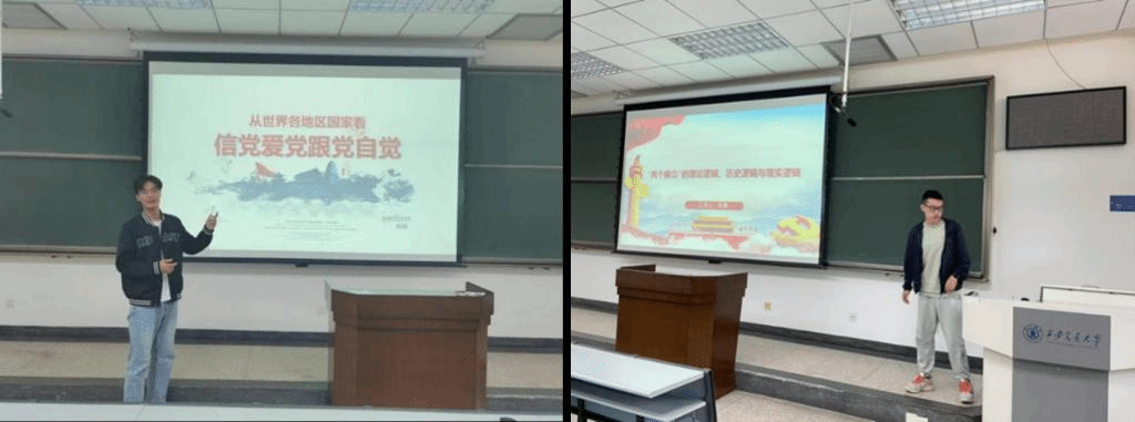 42班第六组杨鑫同学以“‘两个确立’的理论逻辑历史逻辑和现实逻辑”为题汇报了学习体会;第二组魏子铖同学在做题为“弘扬伟大建党精神与西迁精神,争做有志气、有骨气、有底气的新研究生”的分享;第三组杨朔同学以“从世界各地区国家信党爱党跟党自觉”为题了自己的学习收获;第五组潘丽同同学从自身的生活出发,用心感受中国共产党的领导是将人民的根本利益放在首位的,并体会到“西迁精神”是交大学子生生不息的精神养料,不断思考如何弘扬“西迁精神”做有志气研究生,鼓舞着交大人不断地开拓创新、锐意进取。