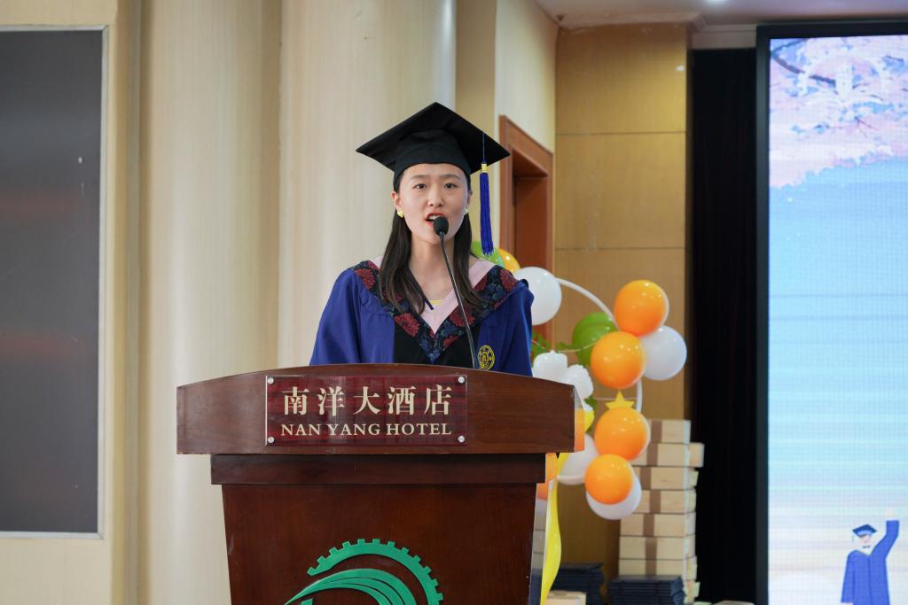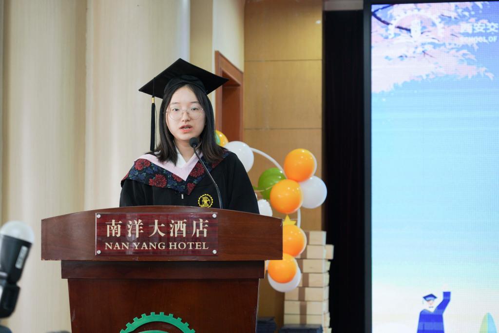 本科毕业生代表张智一在发言中表达了对母校和老师最真挚的爱与感谢,同时也向母校和广大毕业生送上深深的祝福。她表示,交大为广大学子创造了良好的学习氛围和成长平台,愿大家不负初心、不忘来路,得偿所愿、无愧时代,愿交大的荣光长伴你我,他日以同学之名为母校增辉。