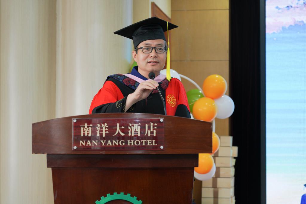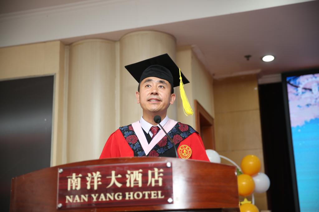 博士生导师梁军教授作为教师代表发言。他从矛盾的普遍性原理出发,认为人本身充斥着矛盾,只有承认人的不完美,才可能在接纳矛盾中走向自由。他表示:“一切幸福都绝非没有忧虑和烦恼,而一切逆境也都绝非没有慰藉与希望”,希望大家正视矛盾,拥抱矛盾,在解决矛盾中走向人生的星辰大海。