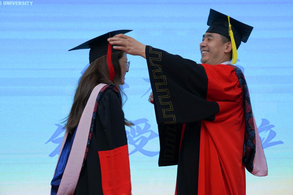 学位授予仪式环节,苏玉波,燕连福,副院长、崇实书院院务副主任陈建兵,张丹与毕业生导师,共同为毕业生颁授学位证书并发放纪念品。2022届毕业生依序上台拨穗正冠,接受祝贺,为在校求学的经历画上完美句号。