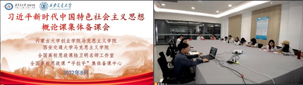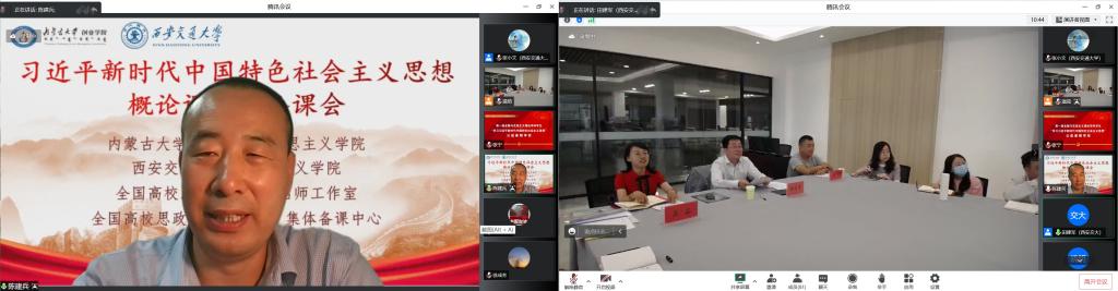 副院长徐成芳教授致辞,分别介绍了本学院本科生思政课建设和推进的现状和经验。内蒙古师范大学、内蒙古农业大学、内蒙古工业大学、内蒙古科技大学、包头师范学院、内蒙古鸿德文理学院等高校的教师共同参与,线上线下600余人参会观看交流,气氛热烈。内蒙古大学创业学院杨逸隆书记主持备课会。
