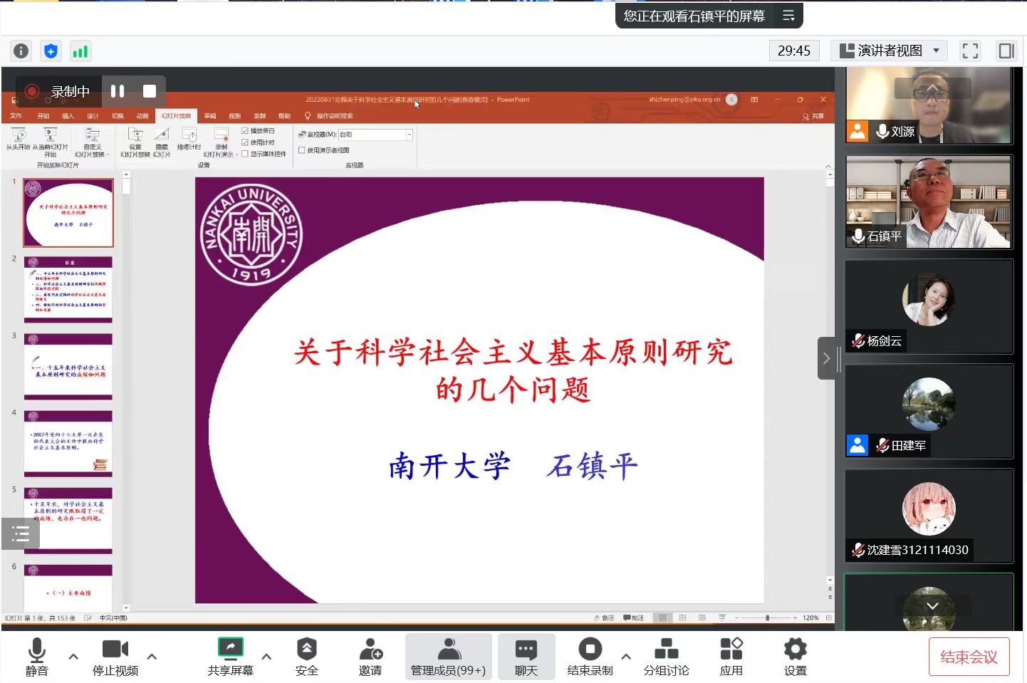 石镇平教授首先回顾了近年来学术界在科学社会主义基本原则研究领域取得的成绩和存在的问题,在此基础上,他分别就科学社会主义基本原则研究的问题逻辑和阶段逻辑、科学社会主义基本原则体系及其内在逻辑、新时代对科学社会主义基本原则的坚持和发展三个方面进行了系统讲授。石镇平教授指出,马克思主义经典作家并没有结束对科学社会主义基本原则的认识,后人还需要结合新的实践不断丰富和发展;科学社会主义基本原则的实际运用,要以具体的历史条件为转移。石教授的讲座高屋建瓴、内容丰富、逻辑严密,引发了全场师生的强烈共鸣。随后,部分师生与石镇平教授就科学社会主义的原则性与阶段论、科学社会主义基本原则与中国式现代化等内容进行了深入交流。