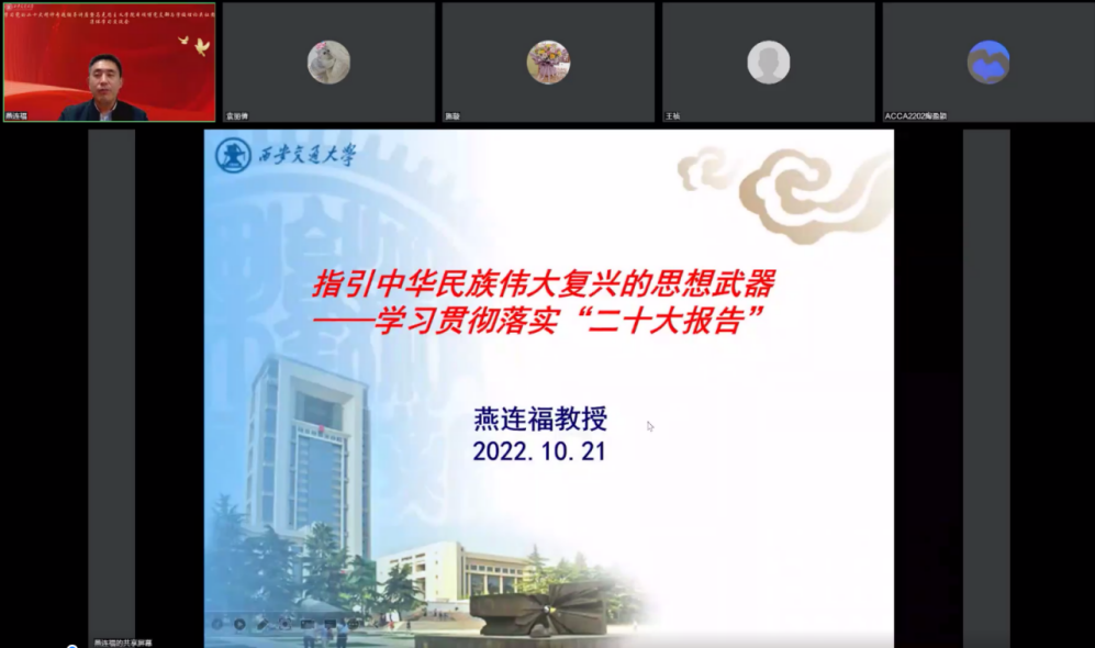 院长燕连福教授作“指引中华民族伟大复兴的思想武器——学习贯彻落实党的二十大报告”专题辅导讲座,带领与会师生共同学习党的二十大报告基本框架,重点解读了要把握的16个重要表述,深入分析了学习贯彻落实的几点思考。燕连福指出,马院学子和理论类社团的同学一定要在第一时间原原本本地认真研读报告原文、原汁原味地深刻领会报告的精神实质,学习的过程中要深入思考、结合实际,带着信念学、带着感情学、带着使命学,切实做到学思用贯通、知信行统一。