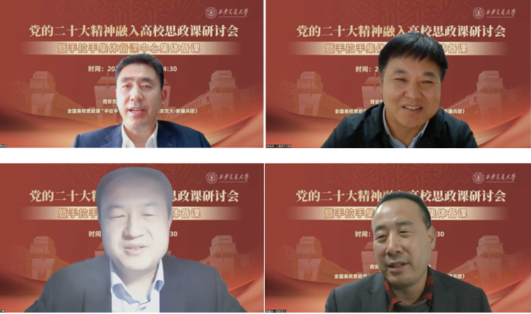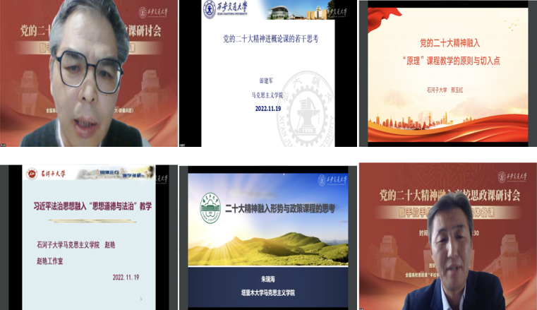 马院李永胜教授、田建军副教授,石河子大学马院邢玉红副教授、赵艳副教授,塔里木大学马院朱瑞海教授先后发言,就党的二十大精神具体如何融入“马克思主义基本原理”“毛泽东思想和中国特色社会主义理论体系概论”“思想道德与法治”“形势与政策”等课程,分享了做法和经验,并提出了具体教学建议。石河子大学马院院长张勇主持教学交流环节的活动。