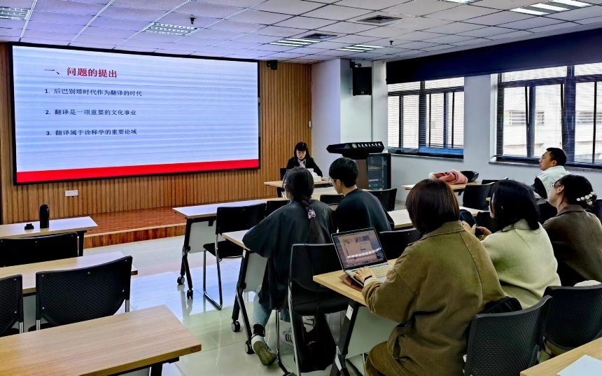 师生作题为“翻译、诠释与文化——基于诠释学翻译理论的考察”的学术报告。国外马克思主义研究所所长杨栋教授主持本次报告。