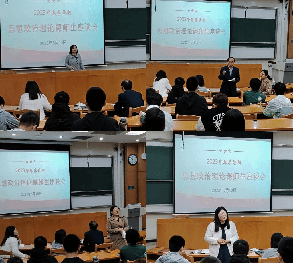 座谈会上,三位授课教师代表首先汇报了相关课程的教学进度和接下来的教学安排。在讨论环节,学生代表踊跃发言,畅谈开学以来在思政课课堂上所面临的困惑,并提出了自己的意见或建议。“纲要”课2班的陈岩松同学针对提升学习自主性的问题,建议课前分享这一环节常态化,由学生进行党史片段或者党史文献的解读,以增强师生之间的深度交流。“习概”课46班的赵家瑶同学认为,思政课堂需要预热,不能只在学期伊始提及本门课的主要内容,而应该在每节课都总结重点,也可以提前询问同学们感兴趣的内容。“马原”课43班的高宇天同学提出思政课要进一步做好思想引导的工作,使课堂知识与同学们关注的时事热点相结合,与鲜活的生活实践紧密结合。“习概”课26班的范海洋同学认为政治课最打动人的是感情,我们思政课课堂应该是充满诚挚感情的。学生代表踊跃发表,座谈会气氛积极热烈。