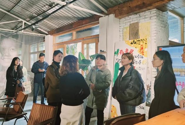 鄠邑区石井街道八号公路是秦岭脚下的“诗和远方”,环山沿线分布四个村落,通过统一规划、区域一体建设充分发挥文化艺术振兴乡村的带动作用,打造国际艺术村落集群。团队沿着八号公路来到的第一站是栗峪口村小游园,在土锤咖啡馆中,成员们与村干部就咖啡馆的创建、招商和运营展开了讨论,认为乡村人才振兴是乡村振兴的关键,吸引人才回村、来村至关重要。接着,樊晓燕老师询问起村子里葡萄种植的具体情况,“收成如何?”“户太八号的品牌影响力如何?”“集体经济的发展如何?”,她的问题直指村民们最直接的劳动收益,希望能够协助他们解决增收难题。通过这种关怀和务实的探讨使得讨论更加富有深度,也为未来提供了可行性的改进方向。