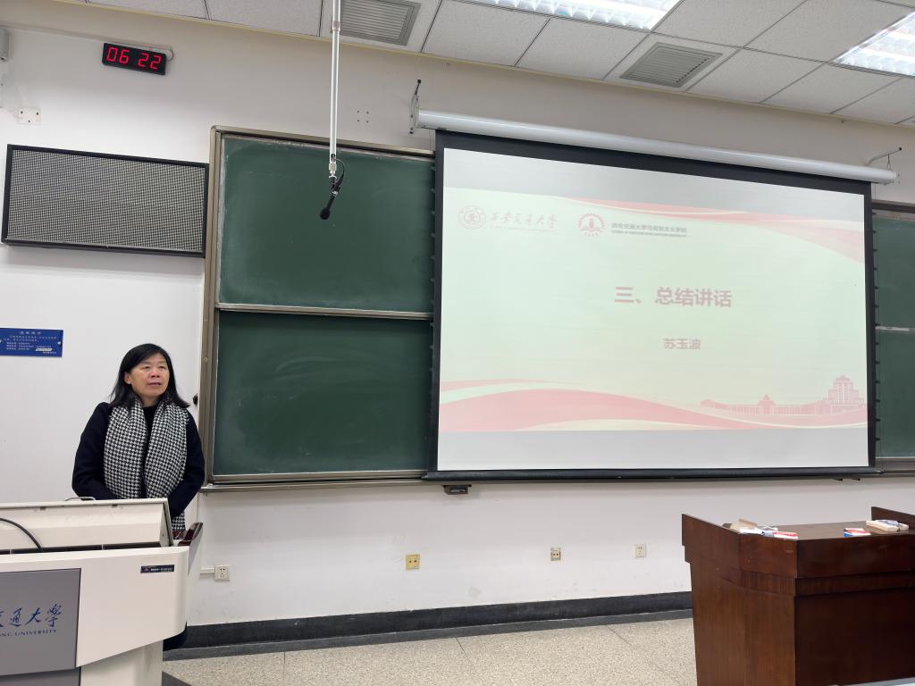 苏玉波书记在总结讲话中指出,过去一年,学院党委在学校党委的领导,坚持以习近平新时代中国特色社会主义思想为指导,深入学习贯彻党的二十大精神,落实立德树人根本任务,扎实推进思政课建设等各项中心工作。她表示,学院稳步发展离不开每一位教师的奉献和努力,学院党委将继续为教师教学科研工作营造良好的环境,进一步引领教师队伍高质量发展。她强调,各系所、支部要充分发挥战斗堡垒作用,针对青年教师做好“传帮带”,坚持集体备课、大团队科研等优良传统,凝聚集体智慧,践行为党育人、为国育才的初心使命和责任担当。