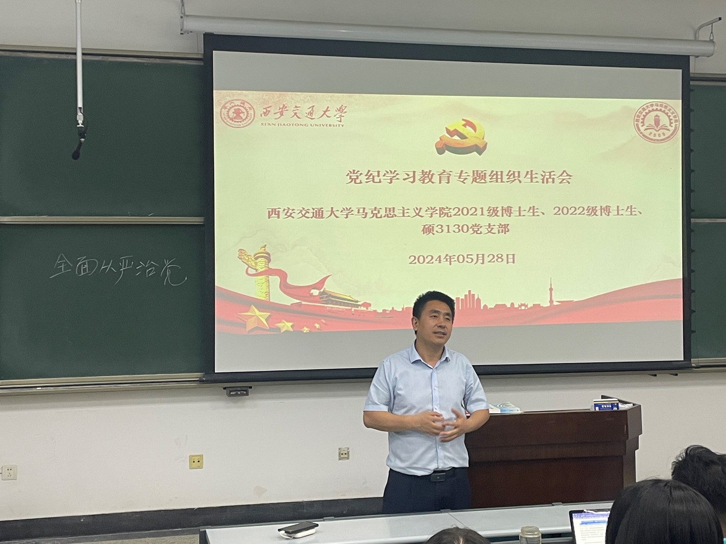 院长燕连福教授走进2021级博士生党支部、2022级博士生党支部和硕3130党支部联合开展的党纪学习教育专题组织生活会,在主C-106教室为支部党员讲授主题党课。参会各支部党员认真聆听,积极参与讨论交流,反响热烈。