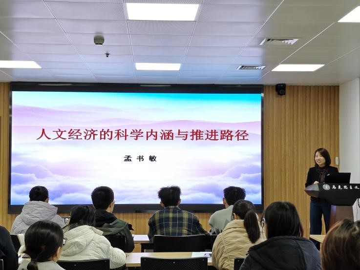 孟书敏老师按照提出背景、科学内涵、成功案例和推进路径的逻辑顺序,系统全面、重点突出地讲授了“人文经济学”这一新的研究空间和学术增长点。她认为,物质的富足、精神的富有是中国式现代化的未来方向和美好蓝图,需要深入探讨文化经济化和经济文化化为何、如何的问题,促进文化与经济双向转化、相辅相成、赋能发展、服务社会。她从以人为本、文化与经济融合、价值创造、可持续发展四点详细阐释了人文经济的内涵要义。通过丰富生动的案例分享,她强调要注重文化资源挖掘与转化、产业融合与创新、人才培养与引进、政策支持与引导、品牌塑造与营销、建设以文化为核心的区域经济,不断为中国式现代化和世界经济可持续发展注入新动力。