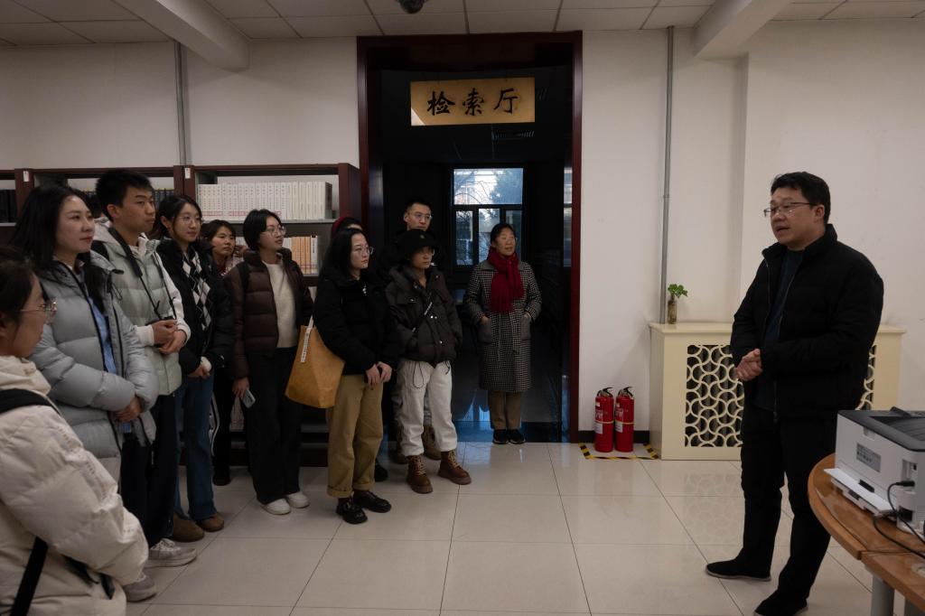 16日下午,基地师生走进中央党史和文献研究院信息资料馆参观学习。信息资料馆流通服务处副处长柳宁介绍道:“这是一座‘很有味道的图书馆’。这里不仅有真理的味道——正如《共产党宣言》中文翻译第一人陈望道先生所言,‘真理的味道非常甜’;也有历史的味道,涵盖了丰富的党史和马克思主义中国化的相关书籍;更有着经典的味道,书架上陈列的经典原著无疑会吸引每一位热爱阅读的同学。”据了解,中央党史和文献研究院信息资料馆收藏有多语种马克思主义和马克思中国化相关文献100多万册,是国内权威、国际知名的马克思主义专业图书馆。同学们在书架间流连忘返,沉浸在浩瀚的知识海洋中,肉眼看见的是有形的、富含极高学术价值的文献丛书,内心感受到的则是无形的信仰、理论和话语的力量。