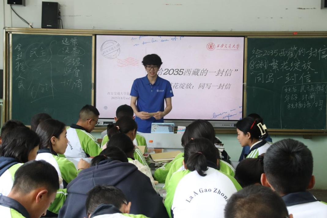 “给2035西藏的一封信”书信活动中,同学们以纸笔书写未来。教室里静谧庄重,同学们畅想西藏未来的交通、生态与教育发展,也思考如何将个人理想融入家乡建设。字句之间,蕴含着同学们对祖国的深切热爱与对新时代的坚定回应。这既是对同升一场旗、同种一棵树、同唱一首歌、同跳一支舞、同比一场赛的深刻总结,更是一堂鲜活而厚重的理想信念教育课,充分展现出西藏青年宽广的视野和强烈的责任感。同学们在信中写道:“祖国的伟大为我们西藏带来美好生活,我要努力让自己的家乡变得更美丽……祝愿祖国万岁,西藏的明天更美好!”