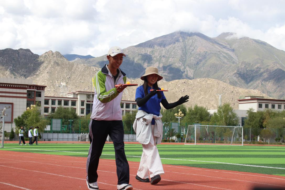 随后开展的趣味运动会将现场气氛推向高潮。拉阿高中操场上一片欢腾,赴藏队队员与学生们共同开展了一场别开生面的趣味运动会。运动会设置了乒乓球接力、投壶、跳绳、夹气球四个项目,既有竞技乐趣,更强调团队合作。汉藏学生混合组队,并肩协作、互相鼓励、默契配合,欢笑声与加油声回荡在整个校园。这场运动会不仅锻炼了体魄,更深化了彼此之间的理解与信任,展现出团结协作的动人力量。赴藏队队员郭彤感叹道:“我们在比赛中共同拼搏、在协作中共同成长,真正融入了彼此的生活。”
