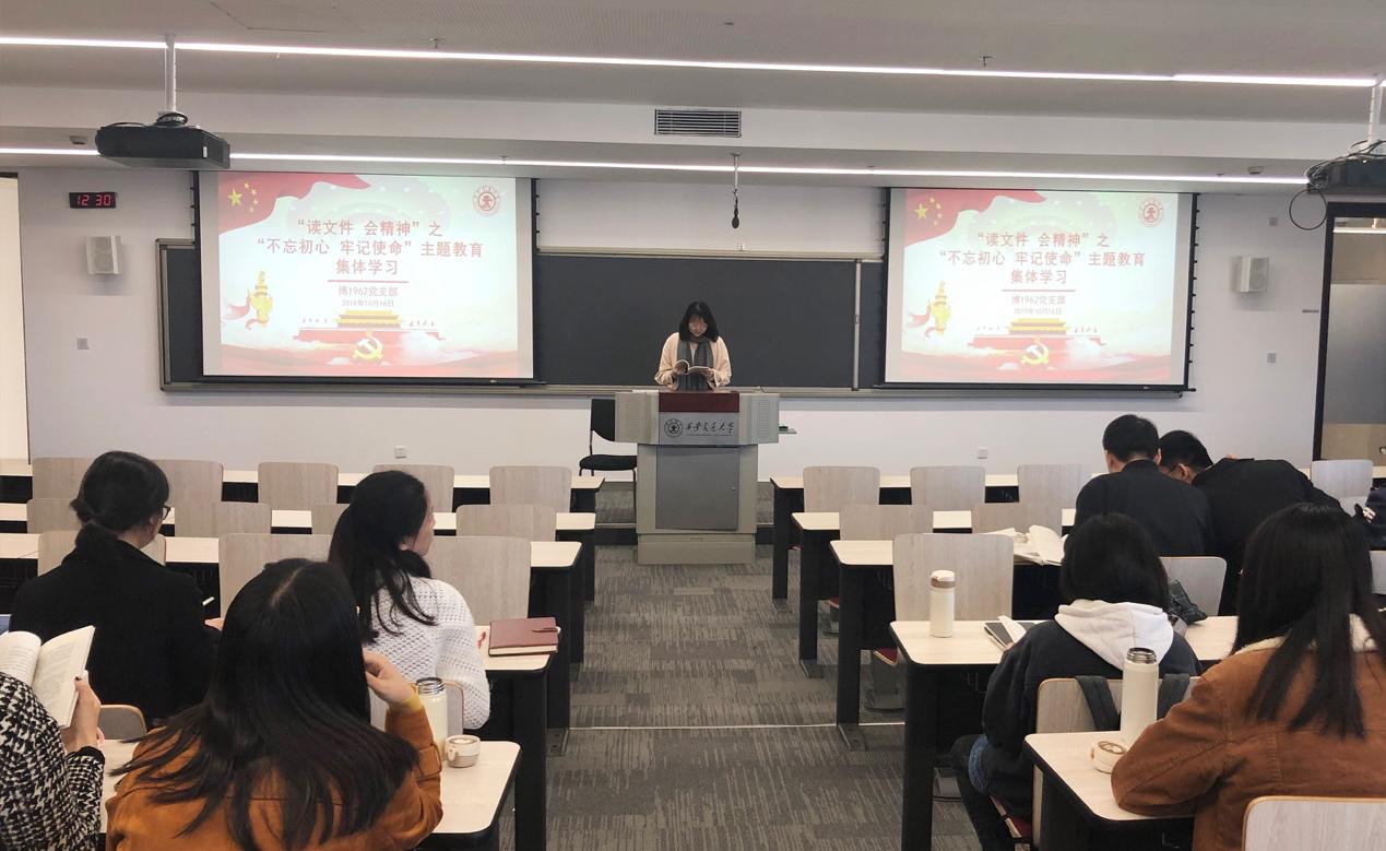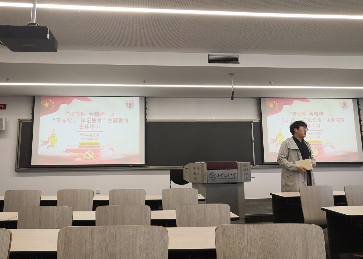 为进一步领会“不忘初心 牢记使命”主题教育的精神要求,博1962党支部于10月16日在创新港涵英楼6106开展了主题为“读文件 会精神”的学习活动,辅导员耿嘉敏以及25名党员(2人请假)参加了此次会议。会议由支部书记刘春霖主持。