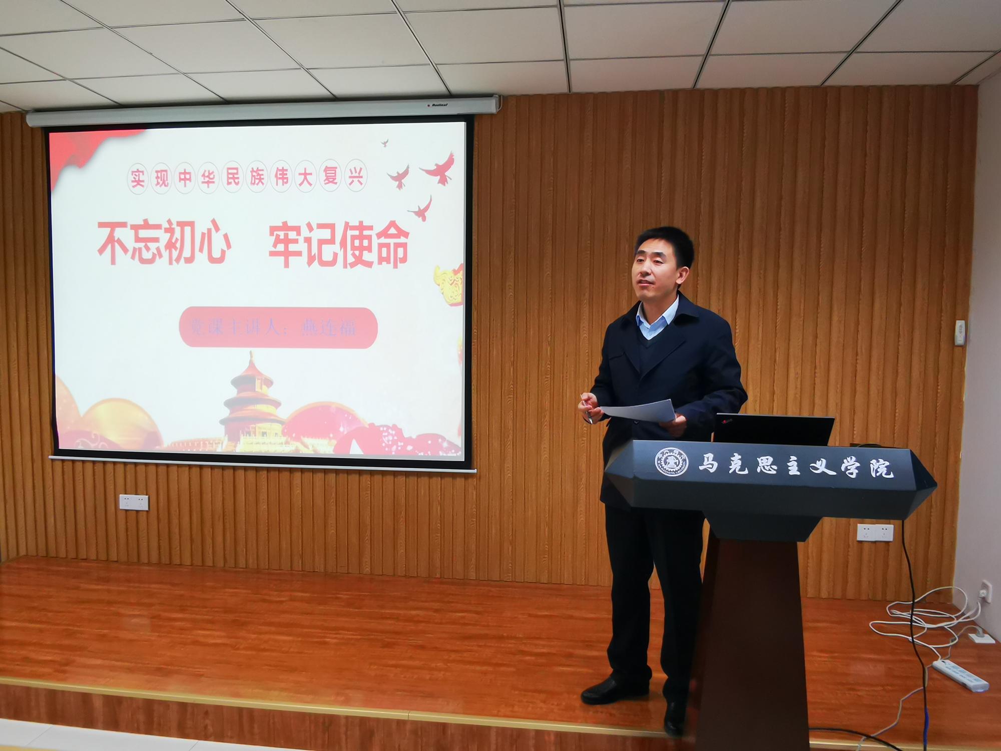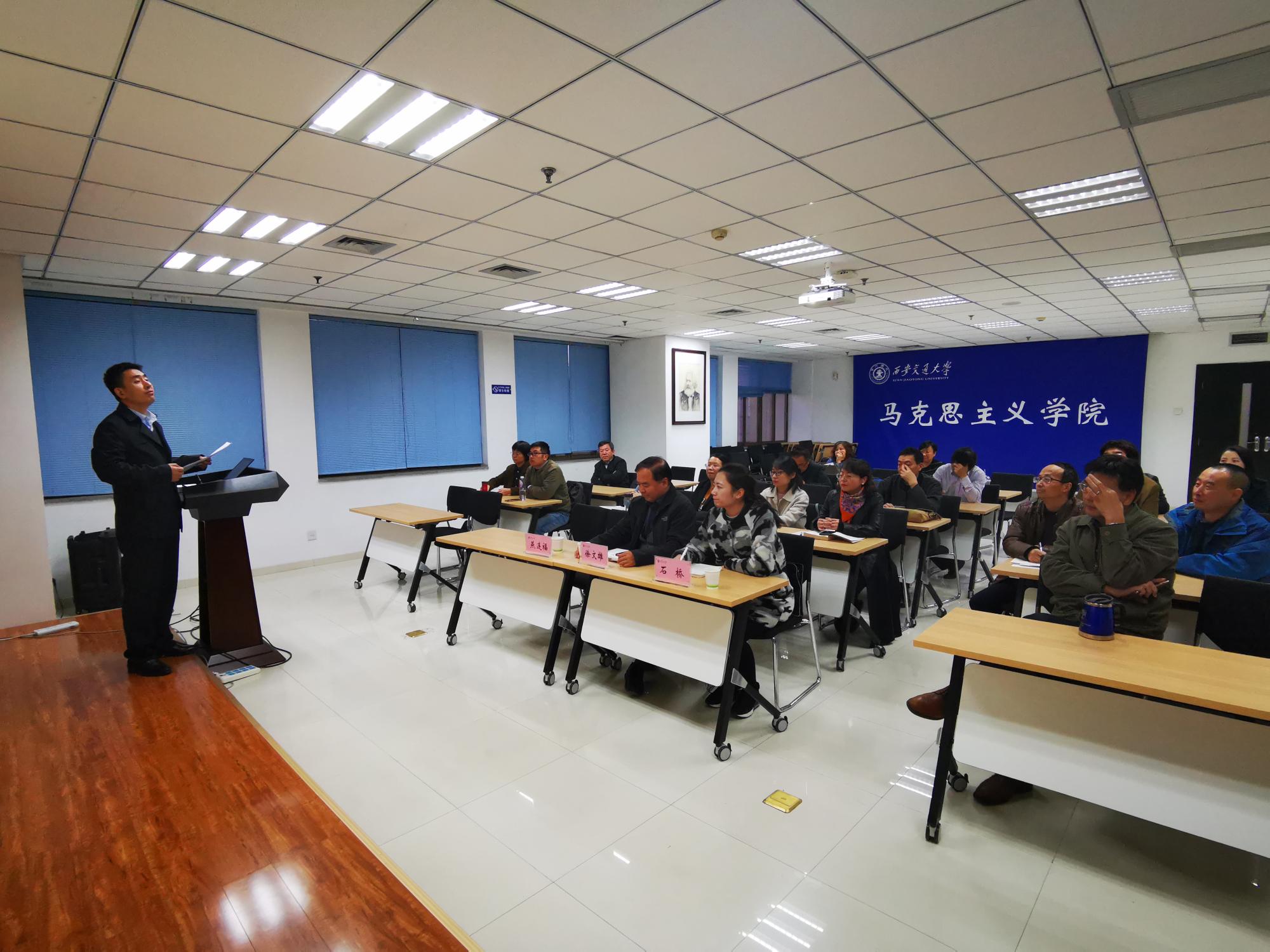 院长燕连福教授为中国马克思主义研究所全体教师讲授了主题为“全面加强马克思主义理论学科建设——‘不忘初心、牢记使命’主题教育调研报告”的专题党课。学校第十一指导组组长徐文雄、组员石桥列席党课现场指导,党课由中马所党支部书记陆淑敏副教授主持。