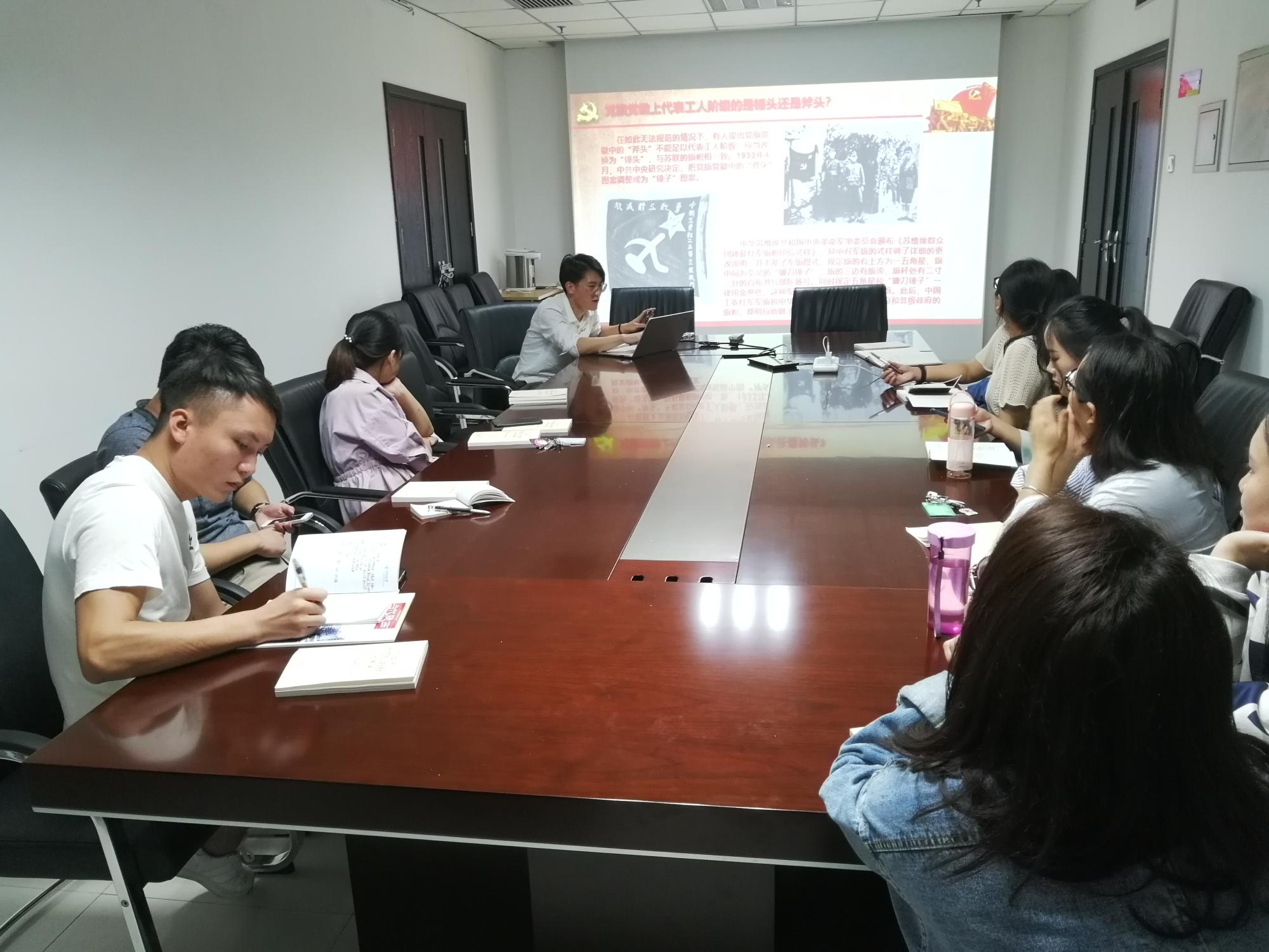 随后,会议进行第二项内容,支部书记刘阳科带领支部成员从党旗党徽的历史演进中,深刻把握“不忘初心、牢记使命”的重大意义。中国共产党的党徽党旗,是中国共产党的象征和标志。中国共产党的党旗党徽制度,是党的制度建设的重要组成部分,每个共产党员都应该郑重对待,能够准确理解、解说党旗党徽的图案和含义。毛泽东有句名言:“世界上怕就怕‘认真’二字,共产党就最讲‘认真’。”在建党即将百年之际,用心认真仰望党旗党徽,真正地牢记曾经面对党旗党徽宣誓时的誓言,具有特别重要的历史意义和现实意义。支部成员在学习尾声,纷纷表示此次学有所获,今后将会以更加严肃认真的态度对待党旗党徽,对待支部活动,对待学习生活中的每一件事。