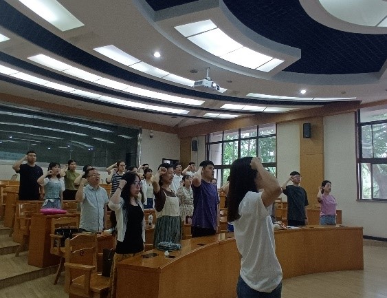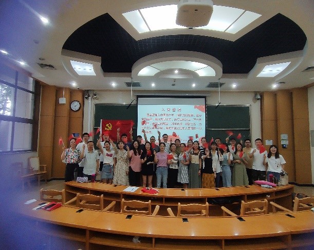 最后,入党宣誓仪式把本次主题党日活动推向高潮。入党宣誓仪式在庄严的《国际歌》声中拉开序幕,全体党员举起右手,紧握拳头,在领誓人的带领下,面向党旗、庄严宣誓。在重忆往昔中感怀党恩,在重温誓言中牢记使命。预备党员代表李威威同志表示通过入党宣誓,真切的体会到了作为一名共产党员的责任和使命,在今后的学习、工作和生活中,将始终坚守入党初心,永远铭记入党誓词,在思想、组织和行动上以一名共产党员的标准严格要求自己。活动结束后,博1852党支部全体党员高举党旗,喊出“百年华诞恰是风华正茂,祝中国共产党百年日快乐!”