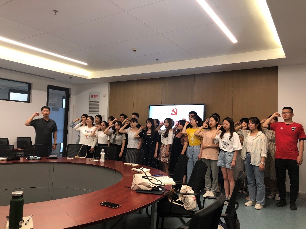 在邢鹏领誓下,硕9114党支部全体同志举起右拳,面对鲜艳党旗,重温入党誓词。