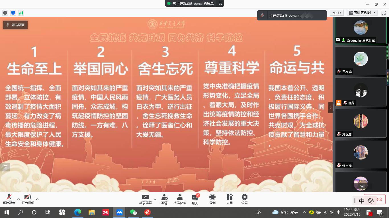 硕1114党支部于1月15日晚开展了题为“弘扬抗疫精神,传承西迁精神”的主题活动,支部全员参加。