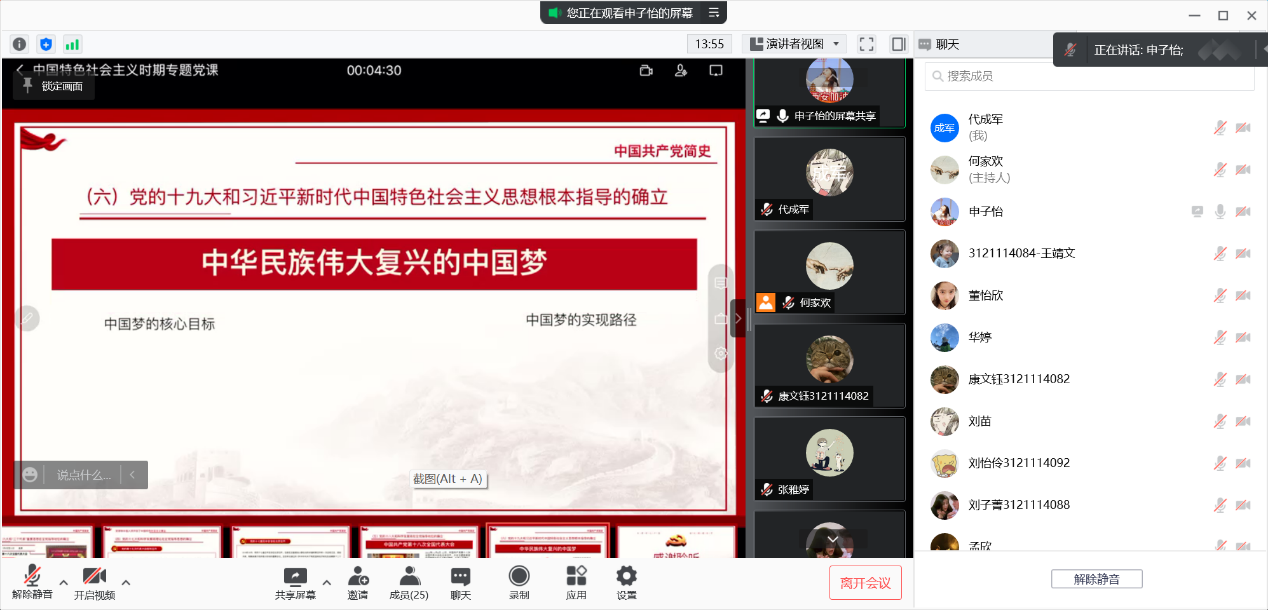 1月15日下午,硕1117党支部在云端举行1月份疫情防控专题组织生活会,聚焦习近平新时代中国特色社会主义思想,深入贯彻习近平总书记关于党史学习教育的重要指示,认真领会二〇二二年新年贺词,理解把握伟大抗疫精神的时代内涵和历史意义,学习遵守相关法律法规和学校防疫政策,让党旗在疫情防控一线高高飘扬。会议由硕1117班党支部书记代成军主持,由爱国党小组负责。