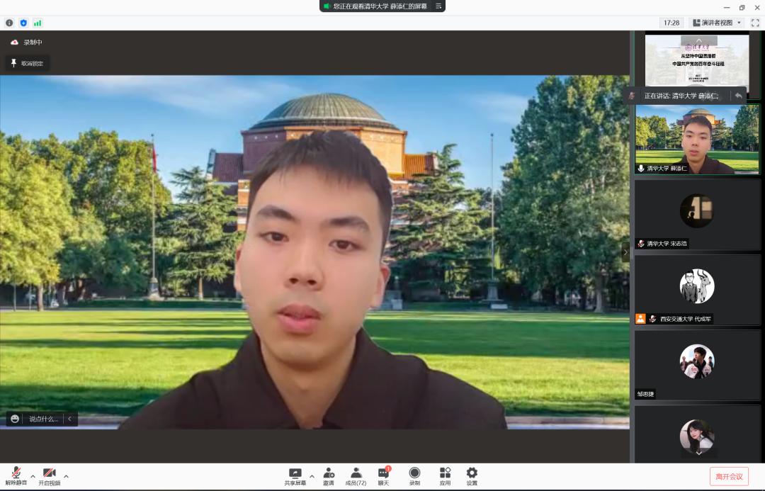 清华大学博士生讲师团讲师、“立言计划”十佳学员薛添仁作题为《从坚持中国道路看党的百年奋斗历程》的主题宣讲。他以中国道路为视角,具体分析四个历史时期中国共产党探索“中国道路”的理论与实践、经验和教训。他指出,在实现第二个百年奋斗目标的新征程上,我们既不走改旗易帜的邪路,也不走封闭僵化的老路,而是要倍加珍惜和坚定不移走中国特色社会主义道路,为实现中华民族伟大复兴而不懈努力奋斗。