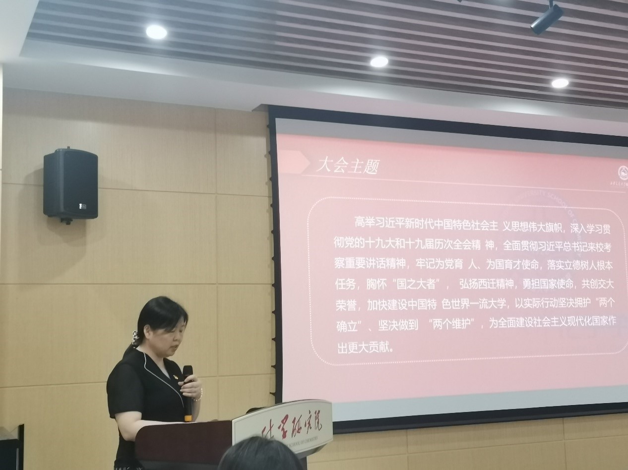 第十三次代表大会报告》,传达相关精神,强调坚持和加强党对学校工作的全面领导,推动学校内涵式教育高质量发展。她从十二次党代会以来“五个坚定不移”的主要工作和“九个坚持”的宝贵经验入手,向大家介绍了未来五年学校工作奋斗目标的“三个必须”和重点任务的“九个更加”,提醒大家要深刻认识并全面把握当前形式与任务,牢记国之大者。将个人发展与学校发展相结,融入时代发展的浪潮,鼓励大家在自己的工作和学习领域做出应有贡献,共创交大荣誉。