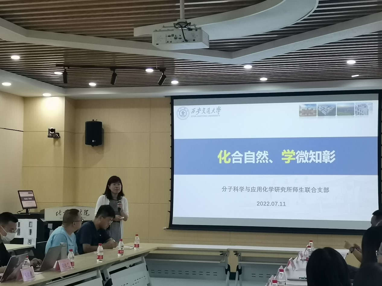化学学院分子所党支部书记梁军艳以“化和自然 学微知彰”为主题,以“什么是化学”为切入点,为大家生动形象的介绍了化学的相关基本概念,结合化学学院的发展历程和目前的发展状况提出了对化学学科发展的深刻思考,为大家分享了化学中的哲学意蕴和化学研究的相关知识。