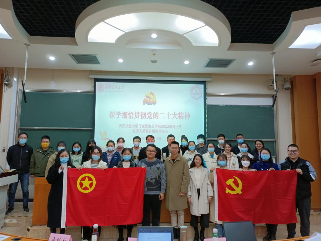 吴鹏副教授、本年度学校博士生标兵李晓利进行关于党的二十大报告研究选题的思考分享。学院团委副书记、辅导员梁佳艺列席参加,2022级博士生党支部书记樊志远主持会议。
