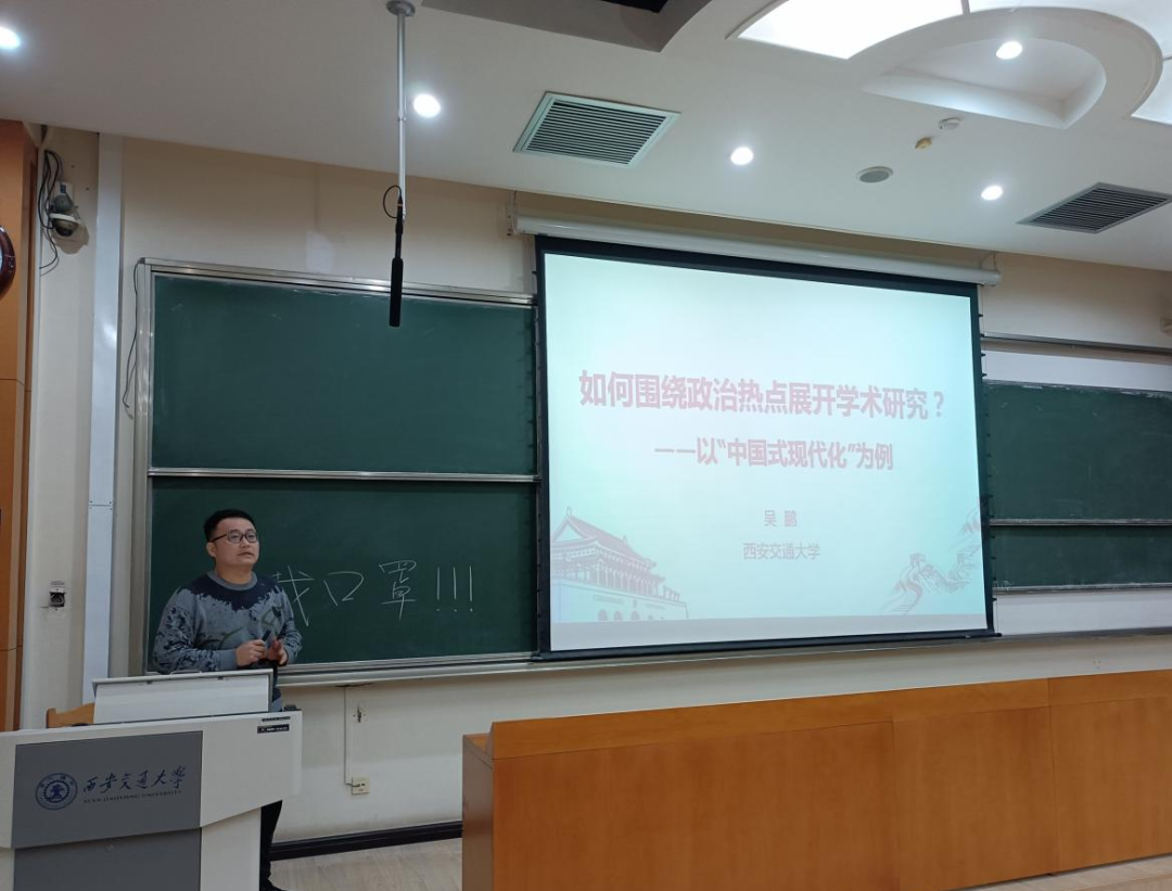 吴鹏副教授以“如何围绕政治热点展开学术研究?——以‘中国式现代化’为例”作为主题,从马克思主义哲学的视角深度解读了“中国式现代化”背后的学理依据,就其蕴含的丰富研究视角进行了详细阐明,同时也从学术研究的角度为支部成员提供了可借鉴的经验方法。吴鹏指出,“中国式现代化”是读懂当代中国的核心范畴,是哲学社会科学研究的重大理论问题。研究中国式现代化的“历史个性”,必须要具备历史学、社会学、哲学等方面扎实的文献积累,要以“社会主义”与“现代化”的关系为基础,深入分析中国式现代化的合理依据。