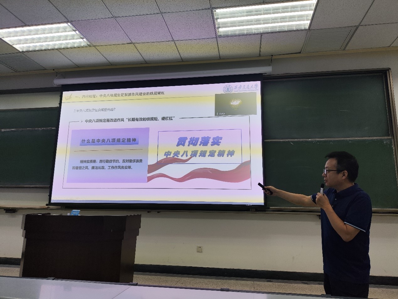 梁军教授以《“两个大局”下中国共产党人作风建设的徒木立信与自我革命》为题,围绕“什么是作风”展开阐述,强调共产党人作风建设是保持党同人民群众血肉联系的根本保障。同时,他简要回顾了“三大纪律六条规定”到中央八项规定的演进历程,通过一段生动的视频案例,展示了作风整顿为群众生活带来的深刻变化。视频中,一方面呈现旧时“三大纪律六条规定”如何赢得群众信任,另一方面突出新时代八项规定对规范领导干部行为、反对“四风”顽疾的重要意义。