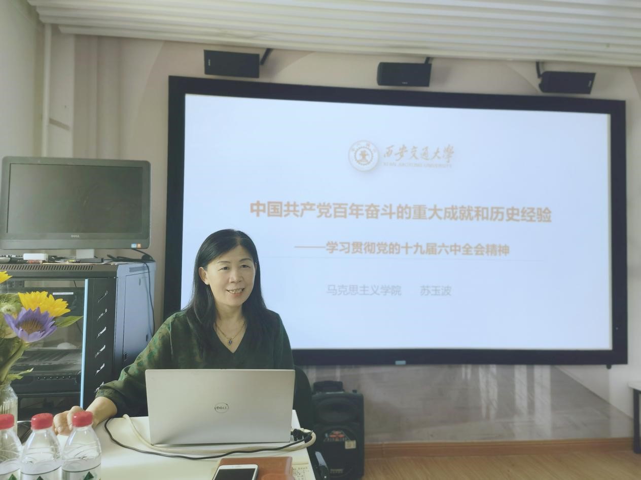 苏玉波以“中国共产党百年奋斗的重大成就和历史经验---学习贯彻党的十九届六中全会精神”为题,首先从总结党的百年奋斗重大成就和历史经验、马克思主义中国化的三次飞跃、深刻认识新时代中国特色社会主义历史性成就和历史性变革、中国共产党百年奋斗的五大历史意义等四个方面全面阐释了党的十九届六中全会精神的精髓和要义,接着,苏老师从大历史观的角度,全面梳理中国共产党在新民主主义伟大革命、社会主义革命和建设、改革开放和社会主义现代化建设、中国特色社会主义新时代的光辉历程和伟大成就,并结合中国共产党的实践探索,深刻解析了伟大建党精神、中华民族伟大复兴的中国梦、党的三次历史决议等重要历史意义和内在联系,最后,通过文本分析的方法,苏老师详细解读了习近平新时代中国特色社会主义思想的科学体系、丰富内涵。