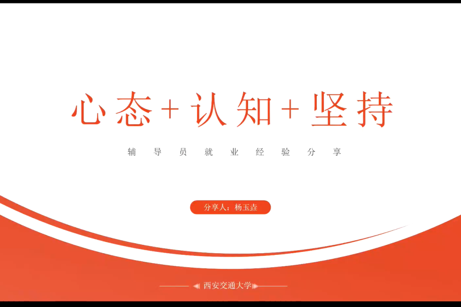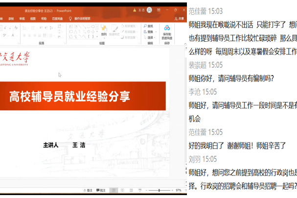 2019级硕士研究生王洁、杨玉垚和席嘉璐分享她们的求职经历与工作经验,为有志向成为辅导员的同学们答疑解惑。研会实践与权益服务部张淑涵主持分享会。