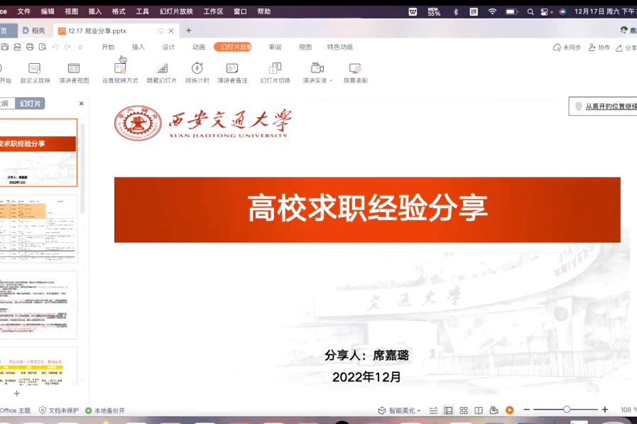 席嘉璐结合自身情况,分享了自己的求职经历。她从报考西北大学管理岗的经历切入,首先介绍了招聘流程和报录比,其次详细讲解了备考策略,通过对思政课教师、辅导员和管理岗三种岗位的对比区分,提倡大家根据自身实际情况选择就业方向,并提醒大家早日完成毕业论文,为求职就业奠定坚实基础。同时她还分享了自己搜集就业信息的方式和笔试、面试经验。最后席嘉璐分享了自己的备考资料,并祝愿大家都能找到满意的工作。